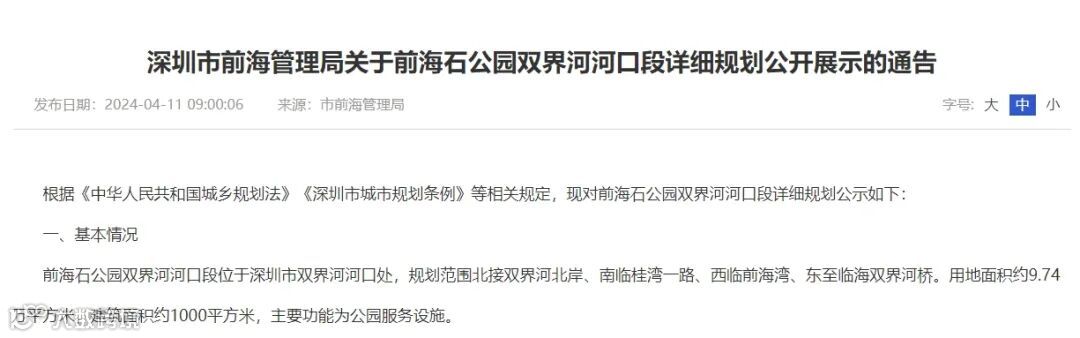 4月11日,深圳市前海深港现代服务业合作区管理局开展《前海石公园双界河河口段详细规划》公示,公开征求意见。规划公示时间为2024年4月11日至5月11日。