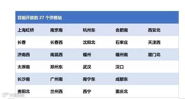 此次试点的供餐站共27个,主要是上海、天津、广州、南京、杭州、西安、沈阳、长春、武汉、济南、福州、厦门、长沙、成都、重庆、兰州等省会及计划单列市所在地高铁客运站。