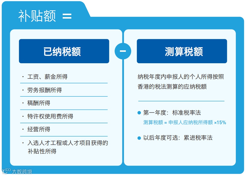 对在深圳工作的境外高端人才和紧缺人才,按内地与香港个人所得税税负差额给予补贴,该补贴免征个人所得税。在纳税年度内,申报人已纳税额减去测算税额,即为申报人可申请当年度个人所得税补贴。
