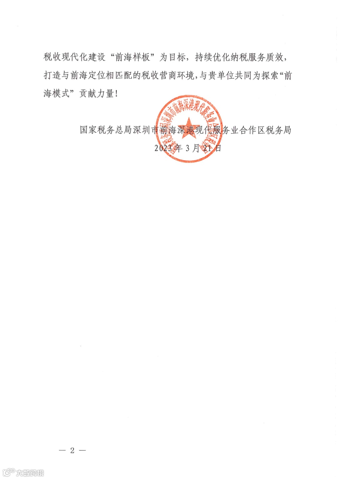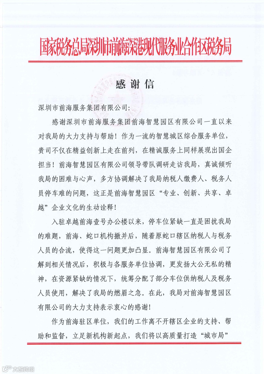 2022年10月,在前海管理局的大力支持下,前海税务局正式入驻前海卓越壹号T1栋前海管理局返还物业办公,同步启用前海卓越壹号办税服务厅。入驻前后,服务集团、智园公司高度重视,通过走访调研、智慧停车系统搭建等,在停车位资源紧缺的情况下,统筹街坊内停车位一体化智慧运营,专业高效地保障了纳税人及税务人员的停车需求,提升了税务人员工作幸福感。前海税务局对服务集团、智园公司的支持表示衷心感谢。