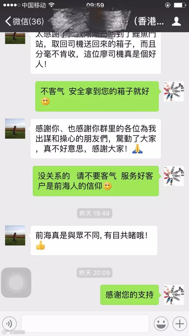在前海企服及绿交公司同事的积极协调下,廖师傅当即按照指示将行李箱送还到了失主赵小姐手中,赵小姐感激不已,强烈要求拿出几百元港币赠予廖师傅以表谢意,终被廖师傅婉言拒绝。