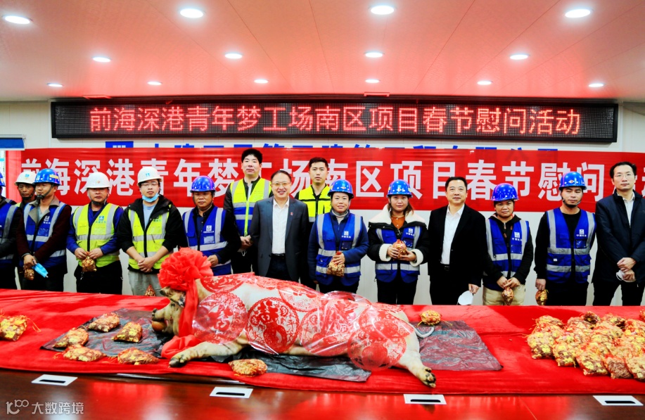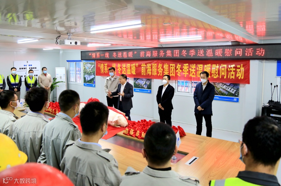 为切实加强对一线建设者的关心,让工友们度过一个欢乐祥和的新春佳节,1月10日上午,前海服务集团董事长陈卫率队先后前往前海深港青年梦工场南区及前海深港青年梦工场北区二期项目部开展“情系一线,冬送温暖”慰问活动,为奋战在一线的建设者们送去了猪肉及福袋等慰问品,并提前送上了节日的问候和新春的祝福,服务集团监事会主席郭起宏共同参加了活动。