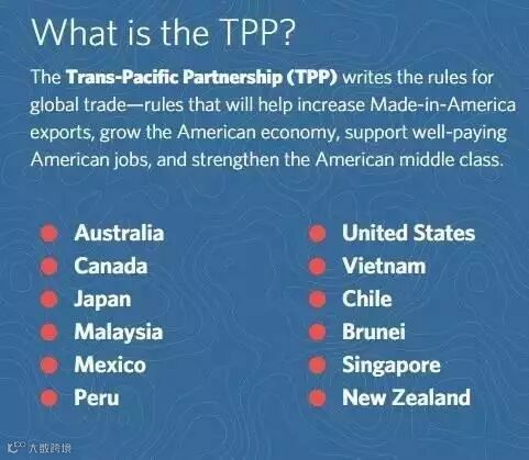 TPP全称“跨太平洋合作协议”,基本上覆盖了环绕太平洋的大部分国家,包括美洲的美国、加拿大、墨西哥、智利和秘鲁,亚洲和大洋洲的日本、马来西亚、越南、新加坡、文莱、澳大利亚和新西兰。