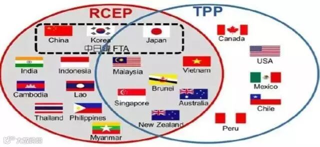 从上面这张图可以看出,RCEP和TPP所涵盖的国家有很多是重合的,只不过TPP包含了美洲的几个国家,RCEP则把印度、印尼等其它亚洲国家都囊括了进去。
