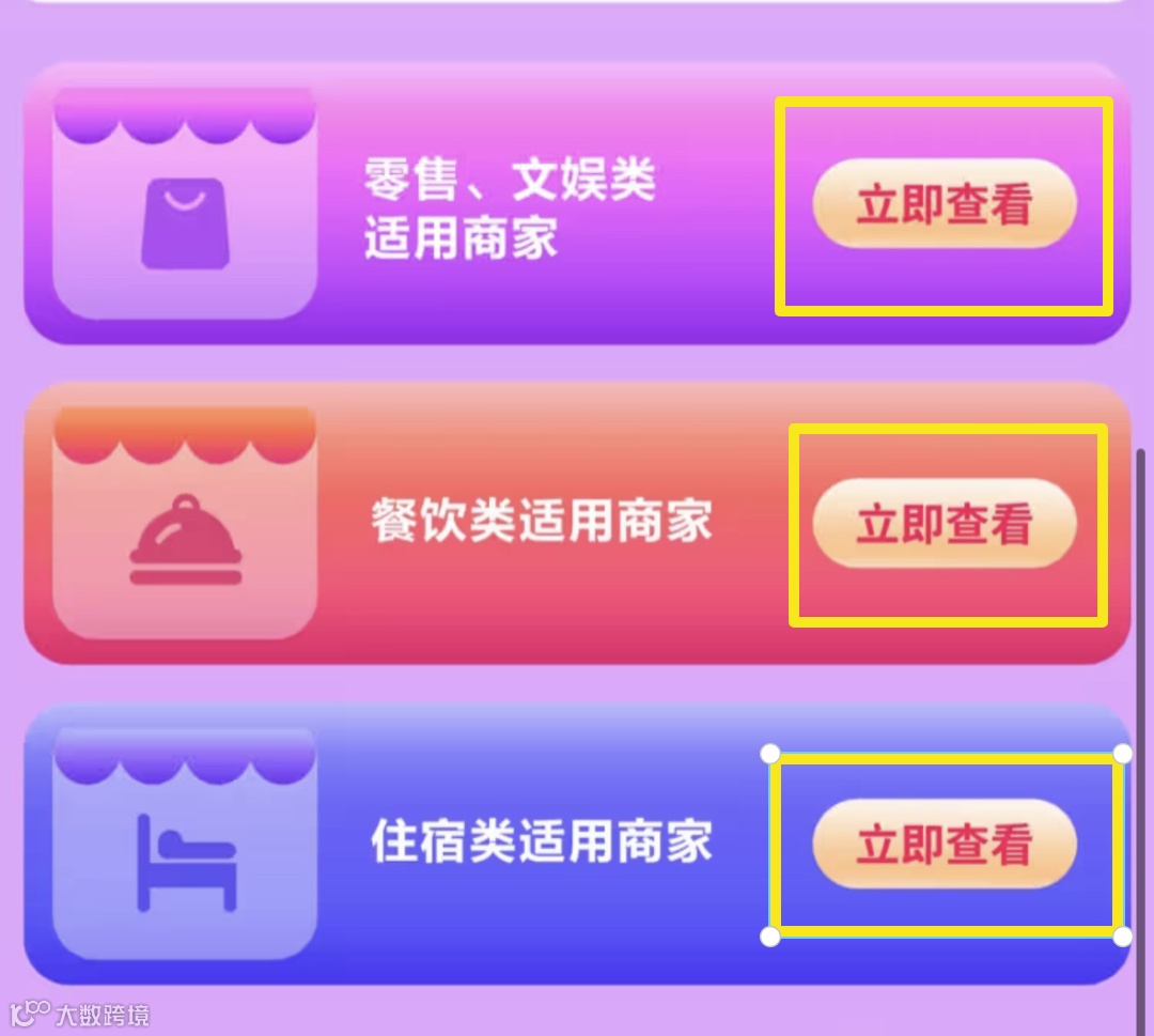 ②点击各类“适用商家”进行查询。