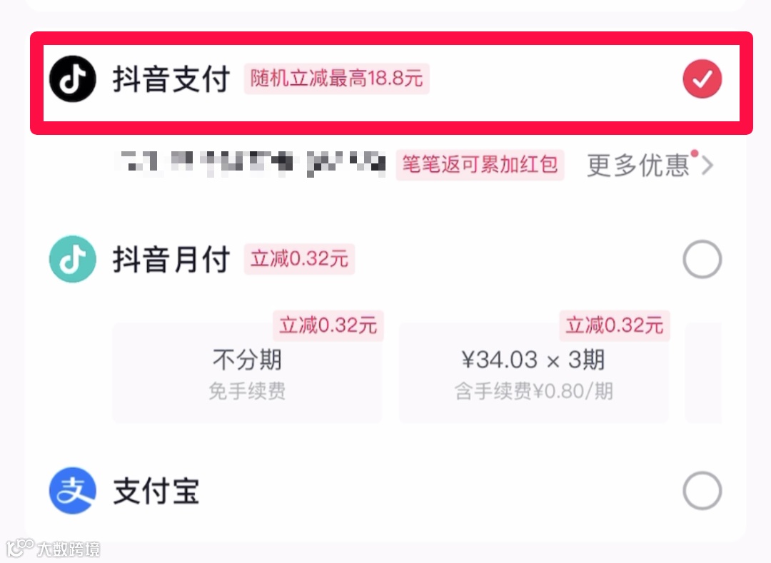 使用抖音月付、支付宝等支付方式