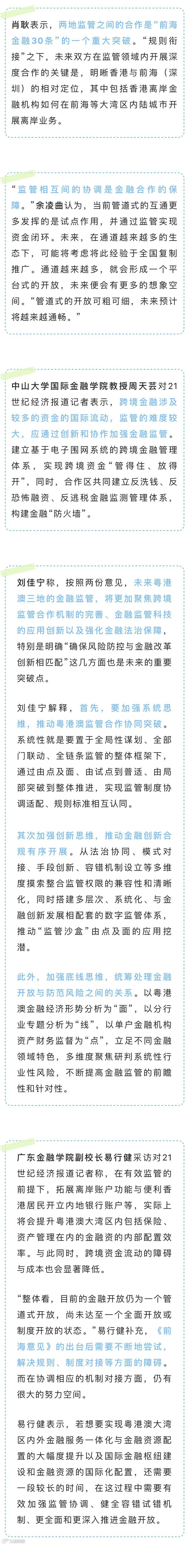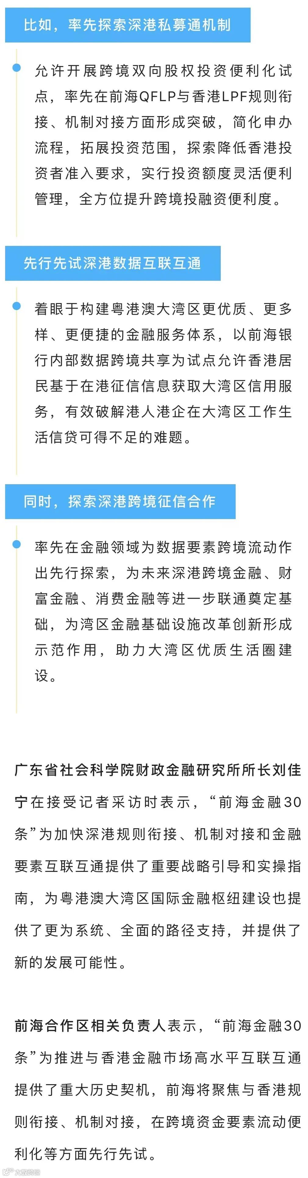 今年2月,人民银行会同银保监会、证监会、外汇局、广东省人民政府联合印发《关于金融支持横琴粤澳深度合作区建设的意见》和《关于金融支持前海深港现代服务业合作区全面深化改革开放的意见》(简称“前海金融30条”),各提出三十条金融改革创新举措,涵盖民生金融、金融市场互联互通、现代金融产业发展、促进跨境贸易和投融资便利化、加强金融监管合作等方面。