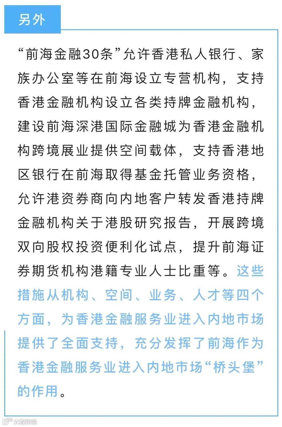 深港金融监管合作也将进一步加强,“前海金融30条”提出将探索与香港金融体系相适应的包容审慎监管模式,健全跨境金融风险防控机制,建立深港金融监管合作机制。并探索跨境金融监管创新,发挥前海合作区作为粤港澳大湾区全面深化改革创新试验平台在金融领域“试验田”作用。