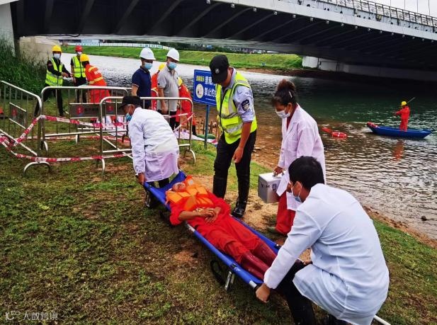 救援过程中遇到游客落水(模拟),现场指挥部指令医疗救护组立即开展水域救援。两名救援人员使用救生圈、救生船将落水人员救起后,快速送往岸边交给人医护员。在医护人员对落水队员进行溺水急救,并送往附近医院做进一步观察治疗。