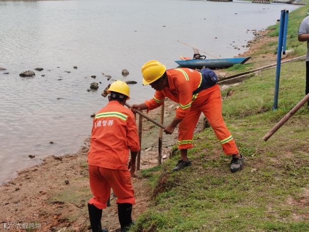 三防专家到达现场后,指出需要对滑坡进行加固控制滑坡险情。工程抢险组队员们在滑坡处设置钢管桩,铺设土工布,并用沙袋加固,在迎水面筑一个挡墙,防止滑体进一步下滑。