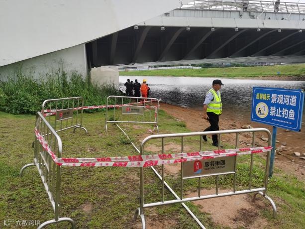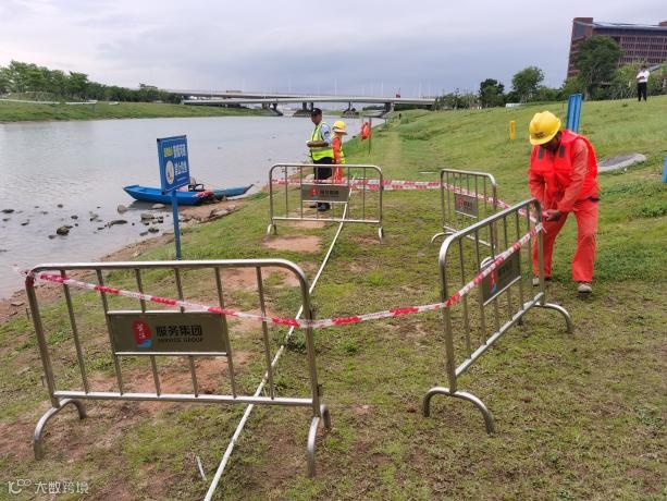 治安维稳人员收到三防指挥部指示后立即抵达事故现场,在确认安全范围后使用铁马和警戒带,再一次对事故现场扩大围挡、警戒,避免无关人员进入事故区域,同时组织下游的几十名群众紧急疏散到安全区域。