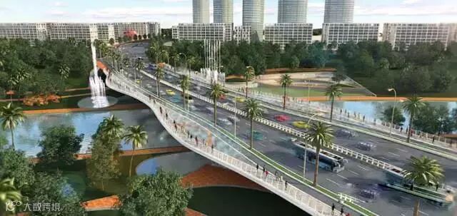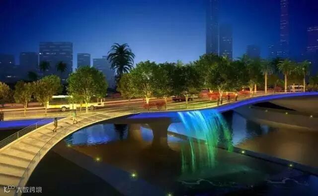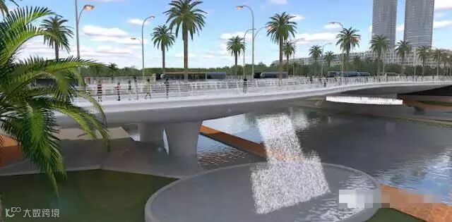 占桥面10%面积为绿化带,种植灌木花卉。桥面两侧形同广场,且将集散人流和休憩人流明确区分开。桥梁结构布局以“亲水”为主题:桥上有灯光喷泉,桥下设亲水池,到了夜晚,与夜空交相辉映,那就是一派水光陆离、繁星点点之景。