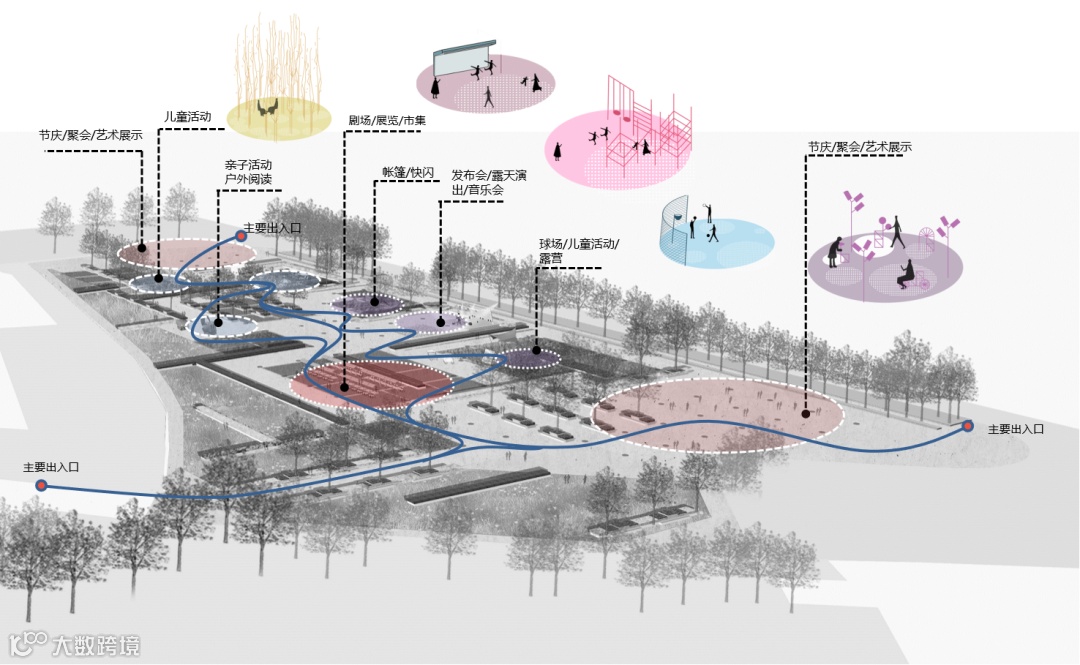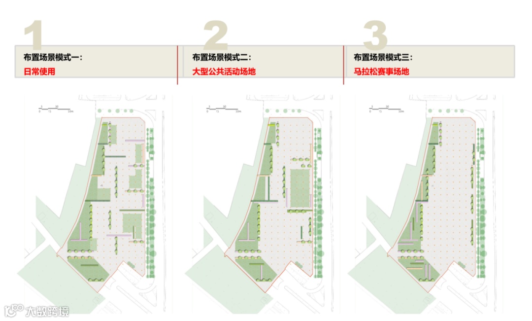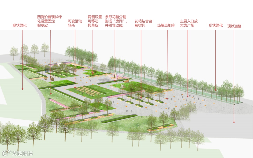 以动态、可变的方式进行提升是本项目的特色亮点。设计通过灵活多变的可移动模块化装置,可结合不同季节、活动需求,布置日常、活动、马拉松等模式的方案,保留该场地举办不同类型活动的可能性。