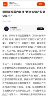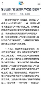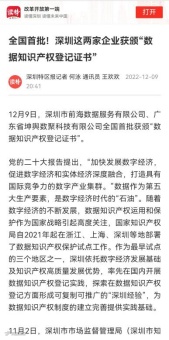 12月9日,前海数据全国首批获颁“数据知识产权登记证书”,被新华网、读特新闻、深晚财经等各大媒体关注报道。