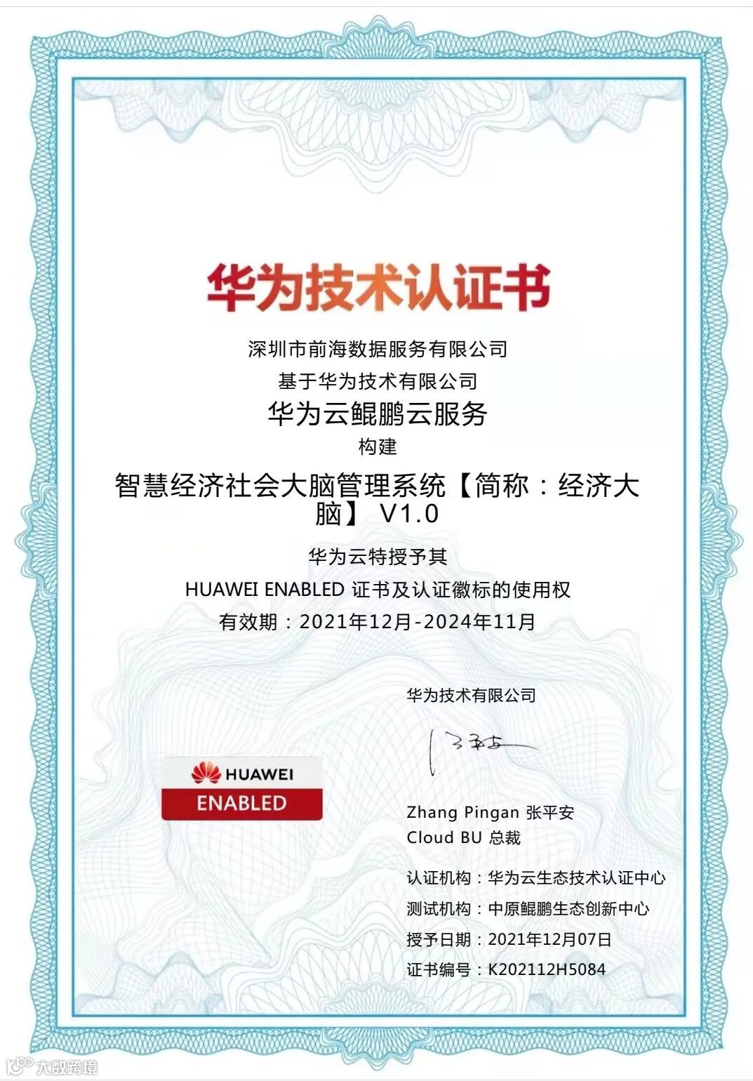 近日,前海数据自主研发的智慧经济社会大脑管理系统V1.0(以下简称经济大脑)正式通过华为云鲲鹏云服务测试,荣获HUAWEI Enabled技术认证书。