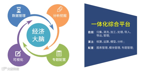 “经济大脑”大数据智能分析平台是一款辅助地方经济运行分析的产品,定位是领导服务的AI秘书,融合了大数据技术、算法及经济学理论,通过数据可视化技术,挖掘和透视经济运行内在规律,连接地区人口、企业和空间要素,结合3D全景地图、指标预警、舆情抓取等技术手段,全方位展示及推送地方经济运行亮点和问题,提供经济大数据相关的一站式数据服务。
