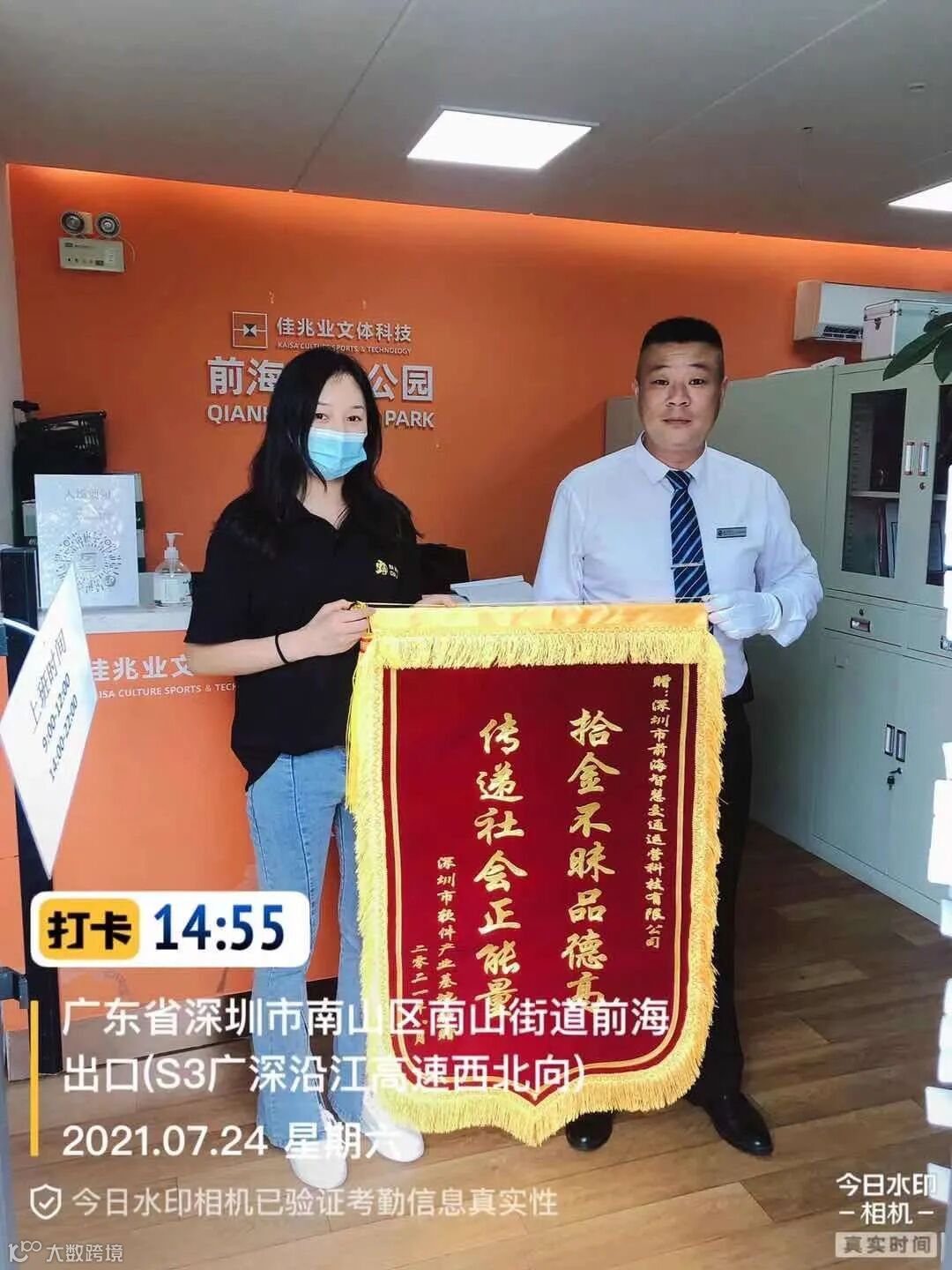 近日,前海智交公司运营项目值班人员在日常巡查过程中拾获一个装有大量现金、手机、证件等贵重物品的手提袋,随后,值班人员积极通过调取监控、信息查询等多途径寻找失主归还物品。面对失主的感谢,值班人员直言“这都是举手之劳,我和同事在工作期间经常会遇到此类事件,只要群众有需要,我们就竭尽所能。”为表达感谢之情,7月24日下午,失主专程赠送一面印有“拾金不昧品德高 传递社会正能量”锦旗,高度赞扬智交公司运营团队拾金不昧的正能量。