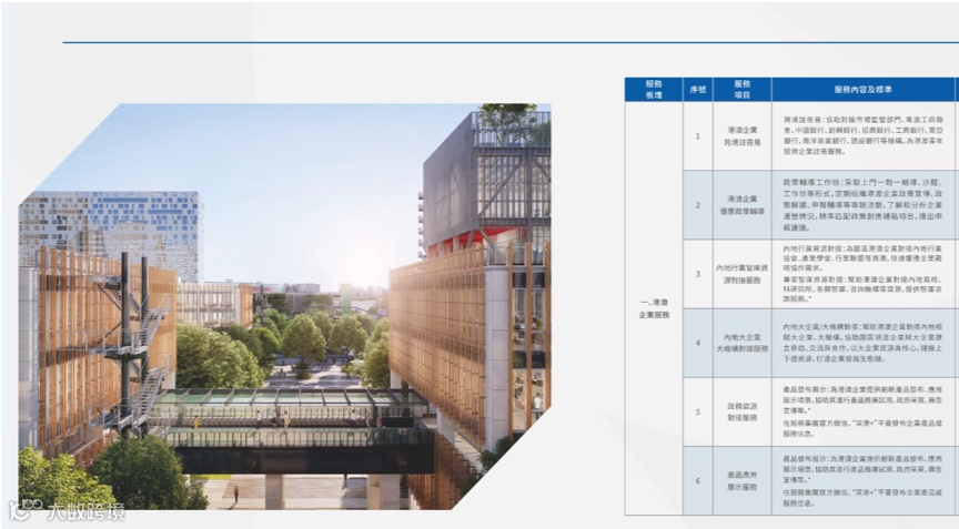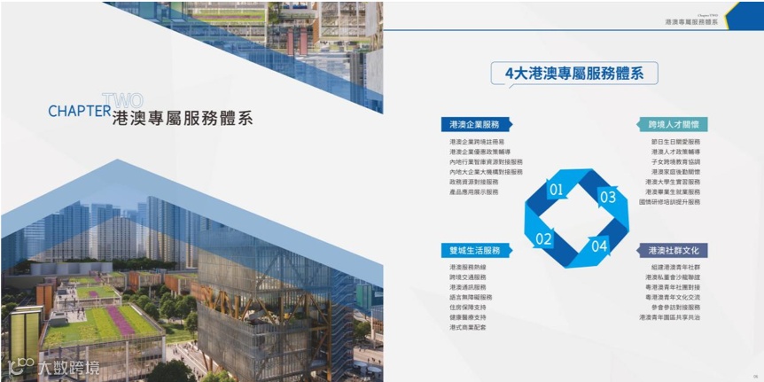 港澳专属服务体系共4大板块26个专属服务内容。从企业服务方面,提供深港通/深澳通注册易,帮助企业快速落地;提供一对一政策辅导、产品应用及资源对接等服务,帮助港澳企业在前海扎稳脚跟,良性运营;推荐港澳企业接受媒体新闻报道,增加企业曝光率,提高企业知名度。从双城生活方面,解决港澳青年与家属衣食住行、健康医疗等诉求,帮助其尽快融入内地生活。从人才关怀方面,提供子女教育、家庭关怀、实习就业等协助,提升港澳青年归属感。从社群文化方面,提供参会参访、社交联谊服务,帮助其尽快建立前海生活圈,提供参与园区治理的机会,提升港澳青年参与感。