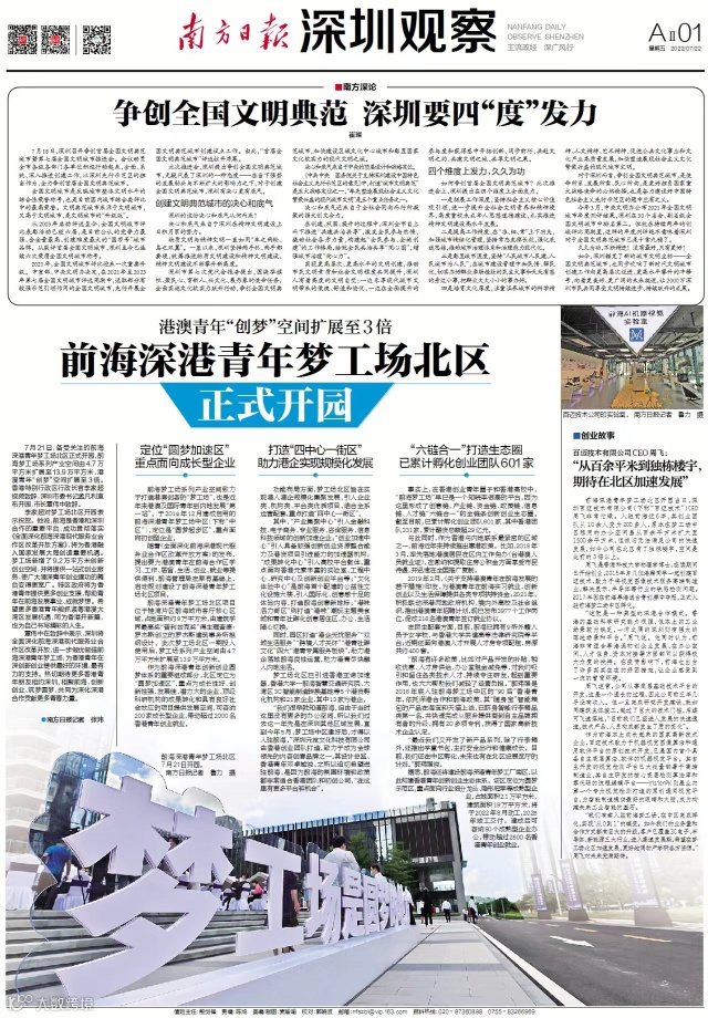 7月21日,备受关注的前海深港青年梦工场北区正式开园,前海梦工场系列产业空间由4.7万平方米扩展至13.9万平方米,港澳青年“创梦”空间扩展至3倍。香港特别行政区行政长官李家超视频致辞,深圳市委书记孟凡利宣布开园,市长覃伟中致辞。