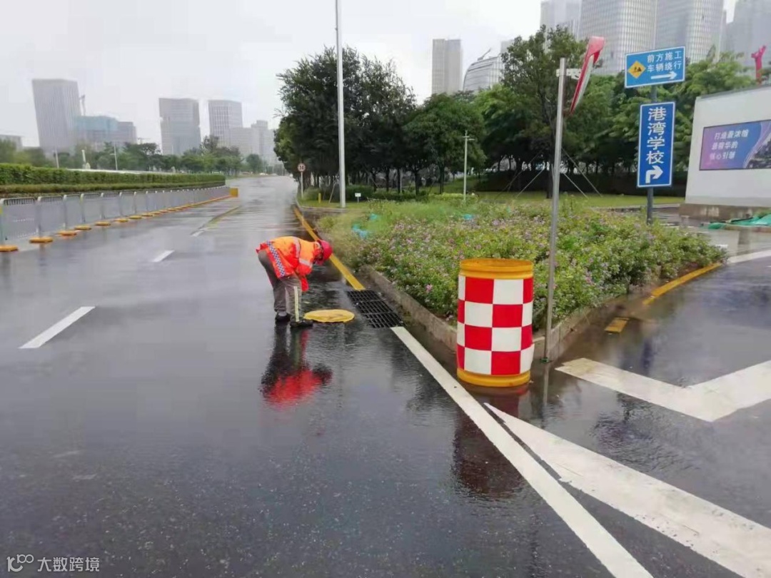 市政公司工作人员正在检查重点区域积水情况
