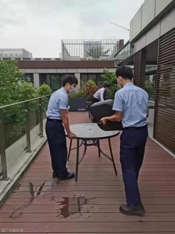 戴维斯工作人员正在转移室外桌椅