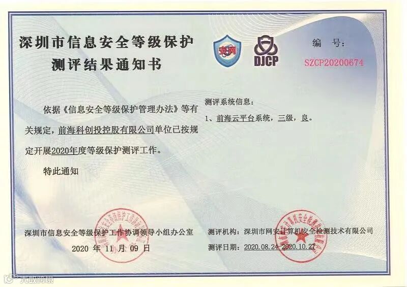 根据国家《信息安全等级保护管理办法》等有关规定,由前海科创投控股有限公司建设的前海云平台系统于2020年11月9日获得国家信息安全等级测评安全保护等级第三级认证。