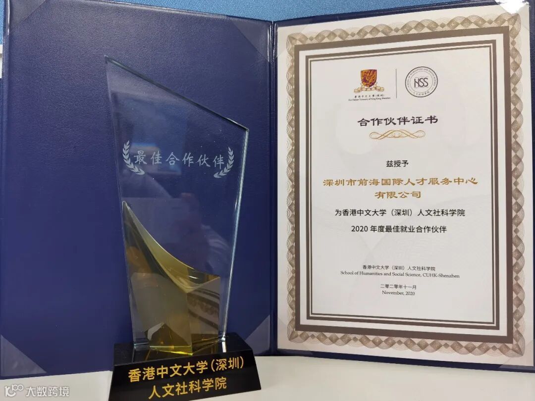 2020年11月22日,香港中文大学(深圳)人文社科学院举办五周年庆典及校企交流活动,对支持学院学生实习、就业的合作单位进行表彰,深圳市前海国际人才服务中心有限公司(以下简称“中心”)获“2020年度最佳就业合作伙伴”殊荣。