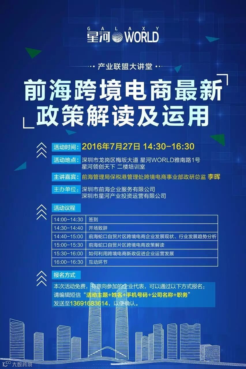 为支持前海星河WORLD联盟战略合作的产业集聚、产业生态圈的创建,推动前海各产业板块的顺利发展,进一步为前海企业提供多层次、跨领域的发展支持与服务,结合前海星河联盟工作部署,前海管理局全资直属公司深圳市前海联合发展控股有限公司旗下企业服务专业机构深圳市前海企业服务有限公司与深圳市星河产业投资运营有限公司将于7月27日举办 “前海跨境电商最新政策解读及运用”讲座活动。活动将为跨境电商企业提供前海跨境电商发展趋势及最新政策解读,为企业实际运营提供更多的引导与帮助。