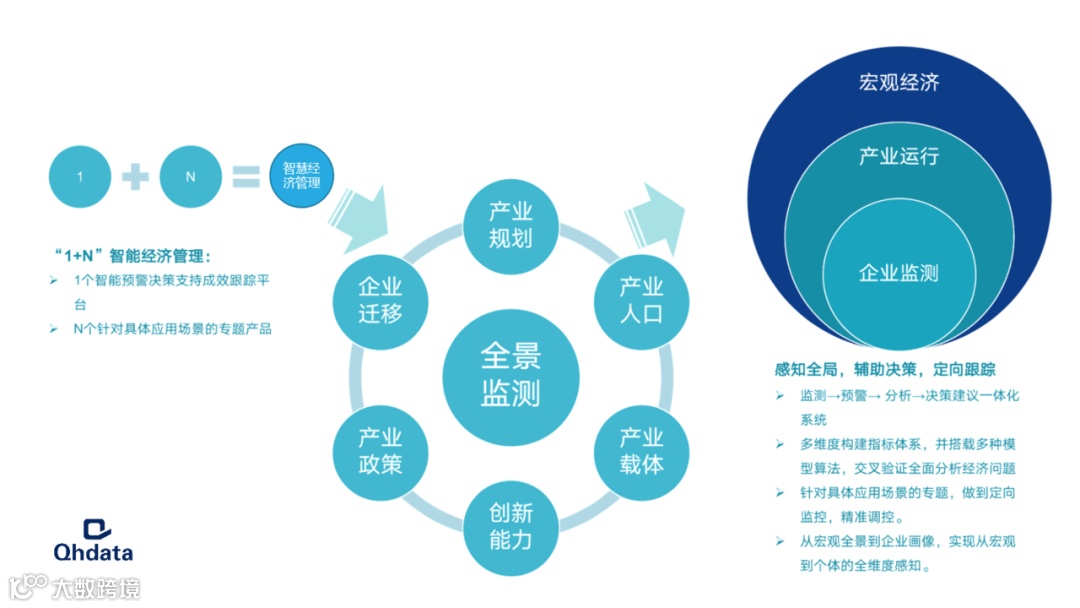 在经济领域中,前海数据基于自身成熟组件和海量数据,推出“1+N”的智慧经济管理服务解决方案,方案围绕经济管理需要提供数据查询、数据分析预警、智能决策辅助等通用功能,并提供全景监测、产业规划、产业政策、企业迁移预警等场景专题监测。