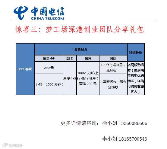 中國電信前海營業廳夢工場直通服務熱線: 13360086606徐小姐