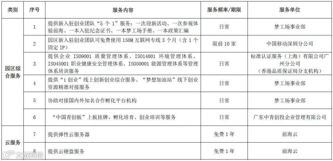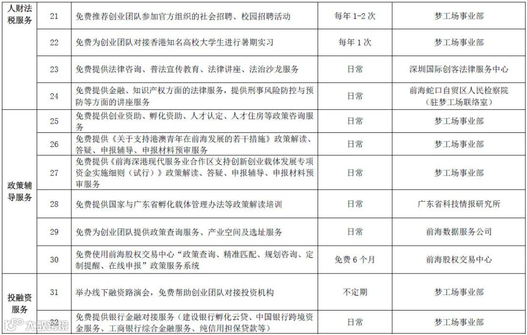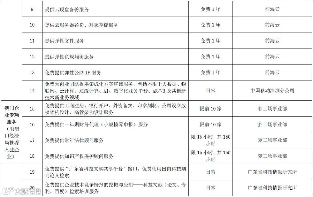 如广东省科技情报研究所可免费提供“广东省科技文献共享平台”接口,免费使用国内科技期刊论文检索;中国移动可为园区新入驻创业团队免费提供3个月的150M互联网专线;前海云服务,可免费向创业团队提供为期一年的弹性云服务器、云硬盘、云硬盘备份、云服务器备份、对象存储、弹性公网IP等云服务;“政策查询、精准匹配”服务,可精准匹配深圳范围内500+项政策补贴,协助企业更快、更精准获得政策扶持等;澳门企业专项服务,可为意向入驻梦工场的澳门企业免费提供工商注册、银行开户、外资备案、印章刻制、公司设立股权架构设计、高管架构设计服务等。