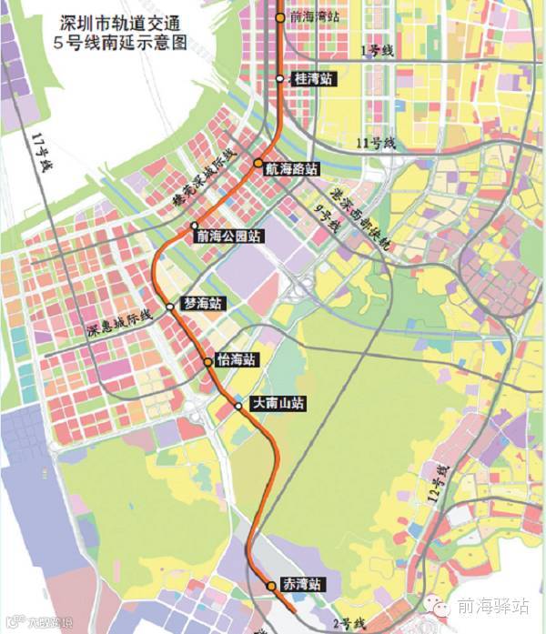 目前地铁5号线(前海湾-黄贝岭)已经开通运营,贯穿城市第一、二圈层,连接城市西、中、东三条发展轴。为了推动前海蛇口自贸片区的发展,5号线将南延线至前海蛇口自贸片区,并通过已运营的线路连接至宝安、深圳北、布吉、罗湖。地铁5号线南延线全长7.6公里,设站7座,分别是桂湾站、航海路站、前海公园站、梦海站、怡海站、大南山站,终点站是赤湾站。其中,前海段(前桂区间至前海公园站,共3站3区间)于去年年底开工建设。这条线路将于2020年建成通车。