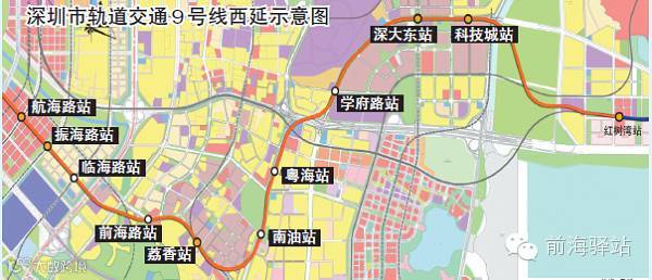 地铁9号线西延是加强前海、南油片区、科技园片区与福田、罗湖中心区联系,线路从现状地铁9号线终点站红树湾站出发,沿途设置科技城、深大东、学府路、粤海、南油、荔香、前海路、临海路、振海路和航海路站等10座车站。其中前海段于去年年底开工建设,全线计划2020年建成通车。
