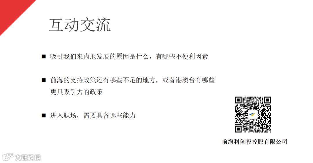 最后,围绕“吸引我们来内地发展的原因是什么,有哪些不便利因素”、“前海的支持政策还有哪些不足的地方,或者港澳台有哪些更具吸引力的政策”、“进入职场,需要具备哪些能力”等问题,现场观众与组织方进行了热烈的交流互动。部分港澳台学生表达了来前海实习兼职和未来来前海发展的意愿。