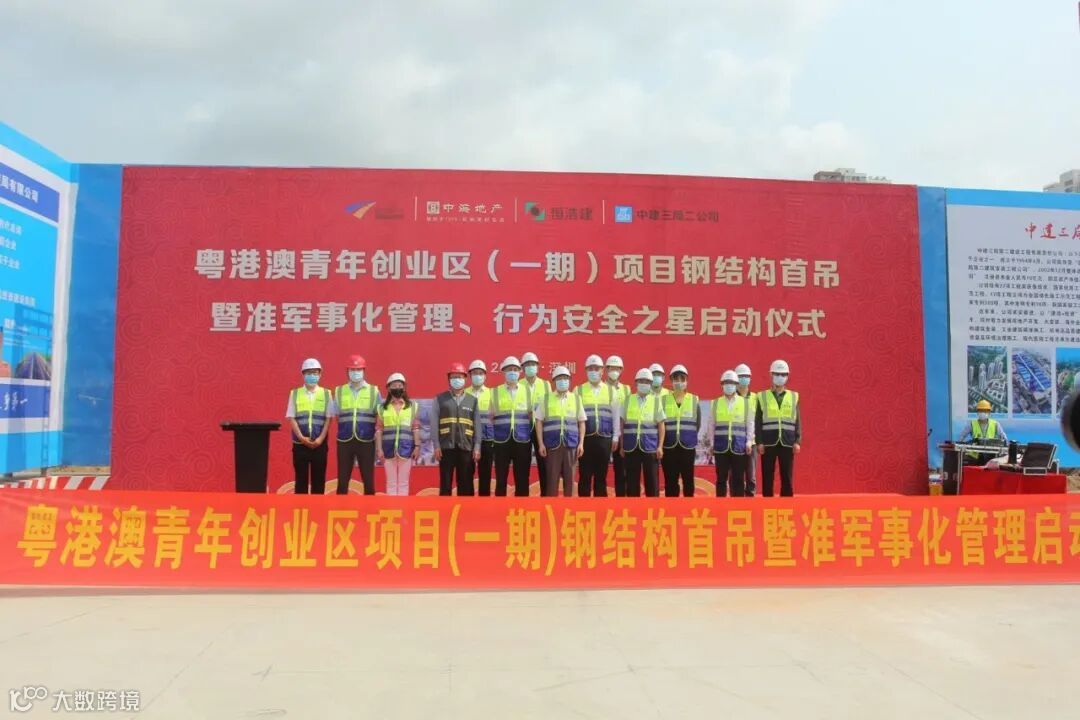 4月21日上午,由前海科创投控股有限公司投资,中海地产代建,中建三局二公司总承包的粤港澳青年创业区项目(一期)举行钢结构首吊仪式。
