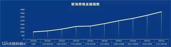 从2013年一季度到2015年二季度,前海跨境金融指数一直保持平稳快速增长。以2013年初为基期(1,000),不到三年的时间内,前海跨境金融指数达到3,712,呈现出持续走高的趋势。2015年二季度跨境金融指数比一季度增长472,增幅达14.6%,表现出良好的增长态势。2015年二季度相比去年同期增长89.5%。