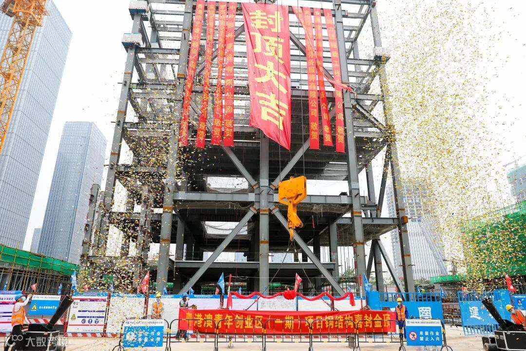 10点8分,随着最后一块钢梁被吊起,粤港澳青年创业区(一期)项目钢结构成功实现封顶,项目建设迈上新台阶。