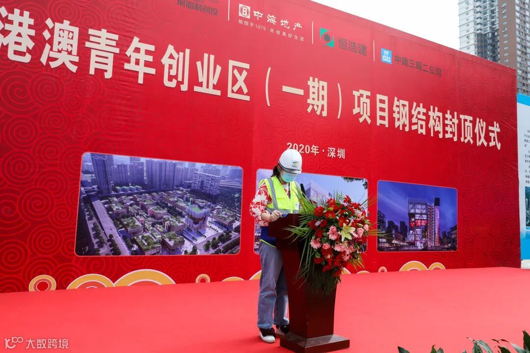 5月27日上午,粤港澳青年创业区(一期)项目举行钢结构封顶仪式。前海科控公司孔佳副总经理,中海地产代建事业部党委书记、总经理安悦东,恒浩建监理、香港华艺设计、中建三局二公司等项目负责人一同出席仪式。