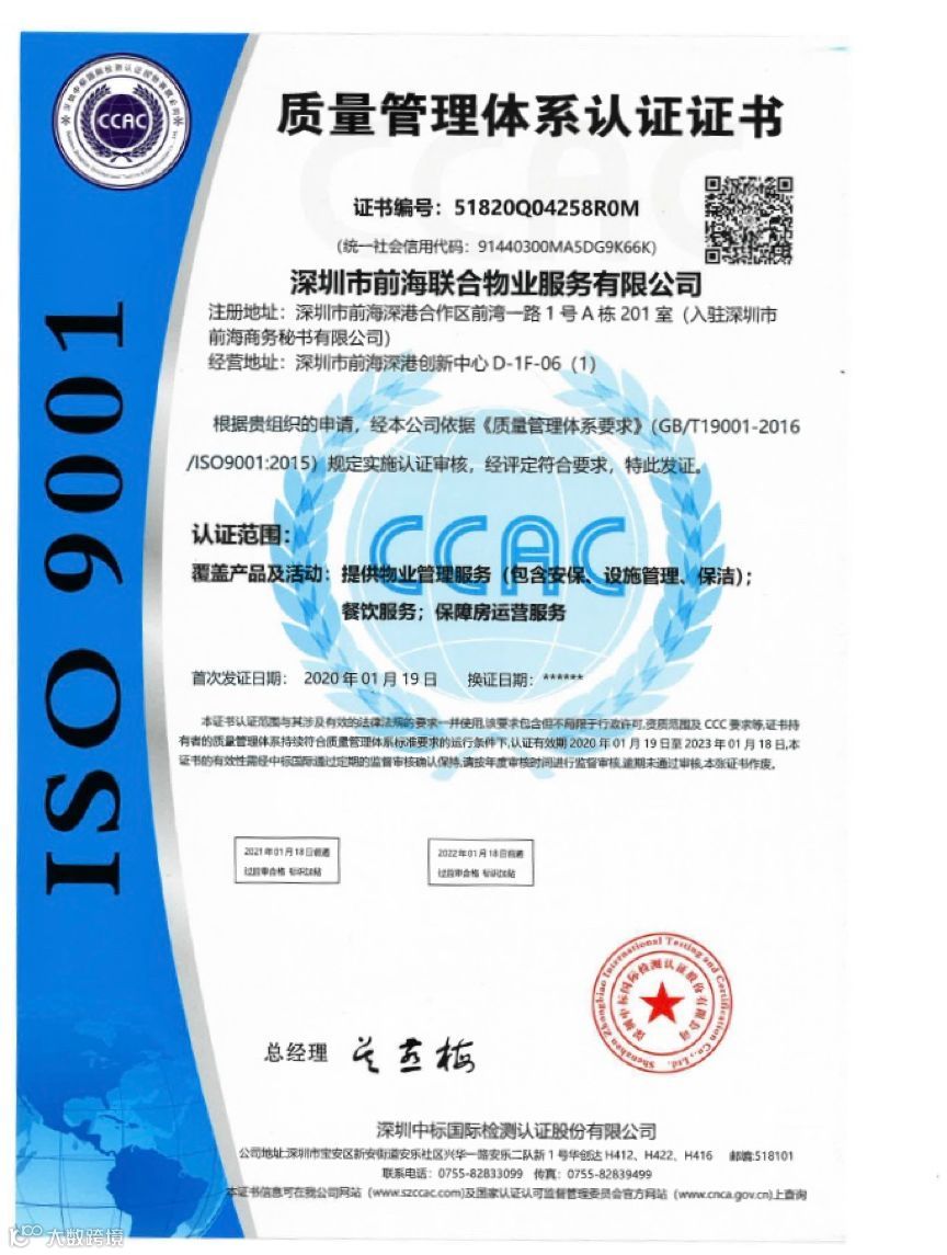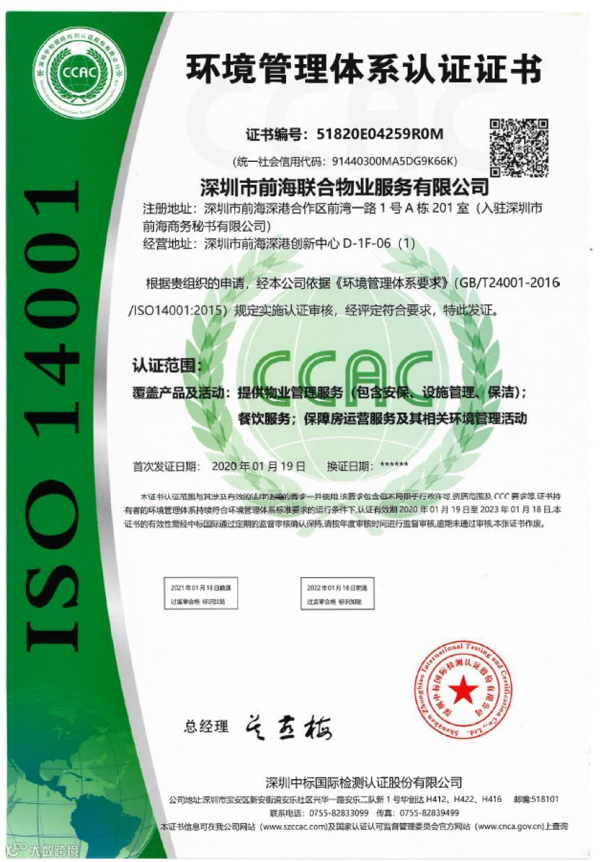 半年来,联合物业不断对标世界先进管理体系,经过周密部署和精心策划,积极推进公司质量体系、环境体系、职业健康安全管理体系认证,并于1月22日喜获三项体系认证证书,使公司管理水平得到本质提升。为前海城市新中心提供优质、高效的营商环境,创建园区综合运营服务新模式。