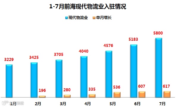 从最新数据来看,7月前海现代物流业入驻企业新增617家,与6月增速基本持平。7月物流企业总数达到5800家,相较1月(3229家)增长79.6%。