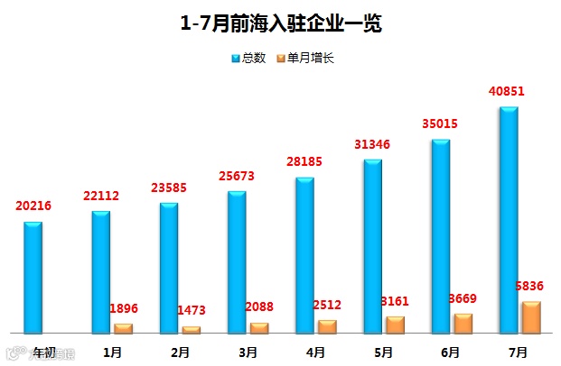 最新数据显示,截至7月31日,前海入驻企业总数达到40851家,7月单月增长5863家,较年初(20216家)增长102.1%。