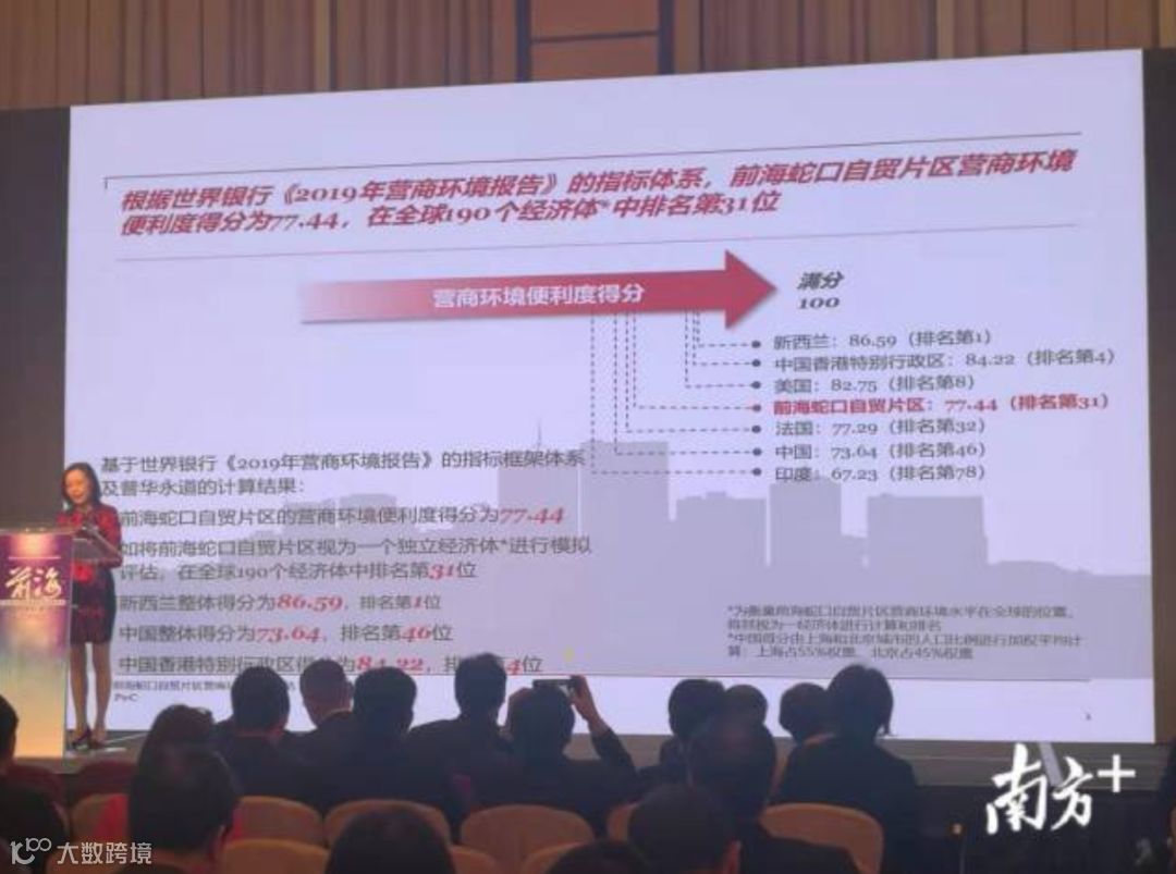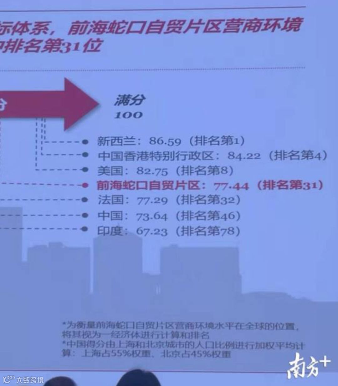 评估结果显示:对照世界银行营商环境指标体系进行评估,如作为一个独立经济体参与排名,2018年前海蛇口自贸片区营商环境便利度得分为77.44,在全球190个经济体中排名第31位,比2017年底的51位上升了20位。