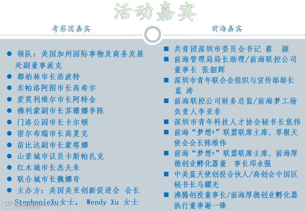 应前海管理局,深圳市青年联合会,前海梦工场,前海梦想+联盟,中美蓝天使创投会(BASIC), 高创会(SVIEF)中国,以及前海“硅谷国际+孵化加速平台(SVIIAP)”邀请,硅谷10余市长及企业高管在美国美亚创新促进会组织下,一行30人嘉宾将于7月16日(本周四)下午1点半,在前海梦工场的会议大厅和深圳及华南地区的创业投资人士近距离交流硅谷创业和创新趋势。