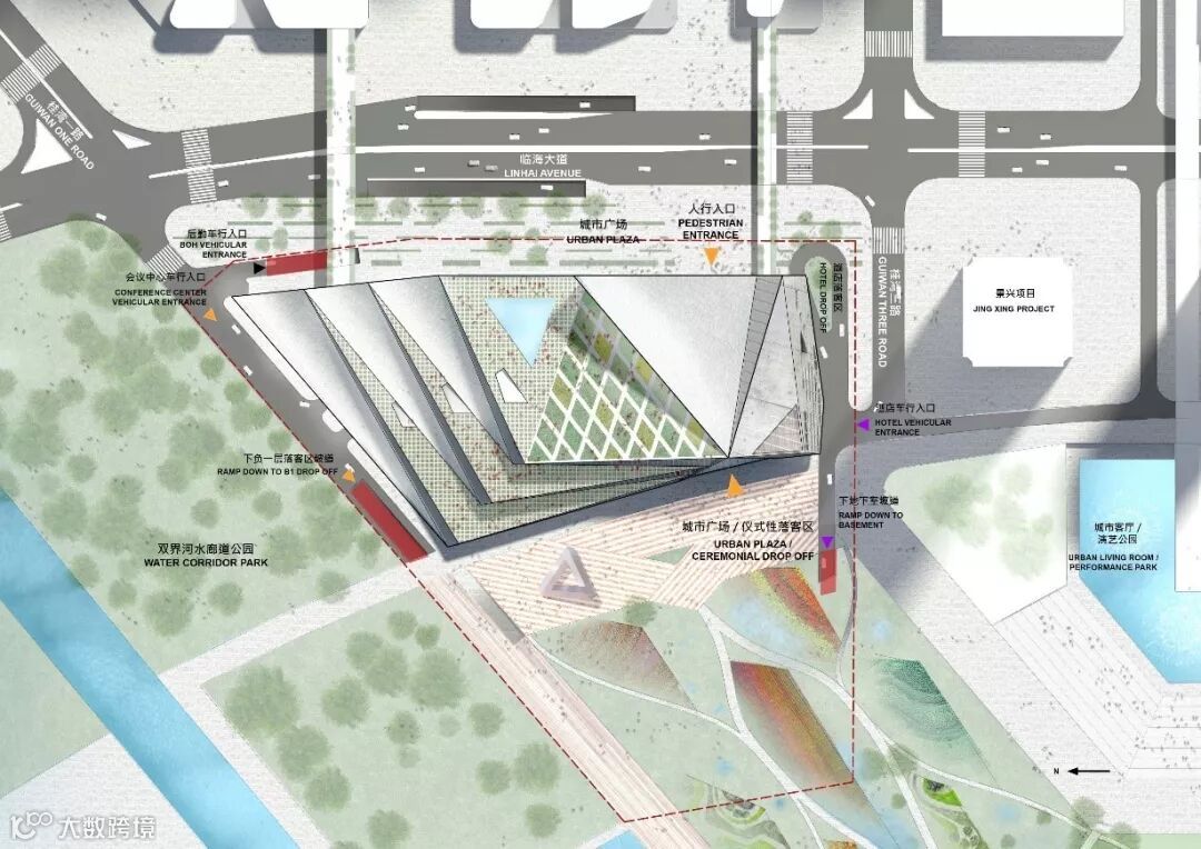 前海智交公司规划设计团队凭借丰富的建筑交通顾问咨询经验,受邀参与了OMA/悉地国际设计顾问(深圳)有限公司设计团队的方案竞赛编制,作为交通顾问全程参与了国际竞赛的各项环节,梳理场地复杂的交通条件,对地下道路、地下环路、地铁线路、地下人行通道、地下停车等进行了系统分析,给予建筑师良好的支撑条件,期间配合建筑师不断优化建筑方案,通过将不同车流客流进行分类,充分利用地面及地下空间,设置了酒店与会议分离,客运与货运分离,车行与人行分离的多层次立体交通系统,并结合项目的高端定位和建筑城市中庭概念设置了滨海仪式性落客区,在多次专家评审汇报中,本项目的交通系统均得到专家的一致肯定。