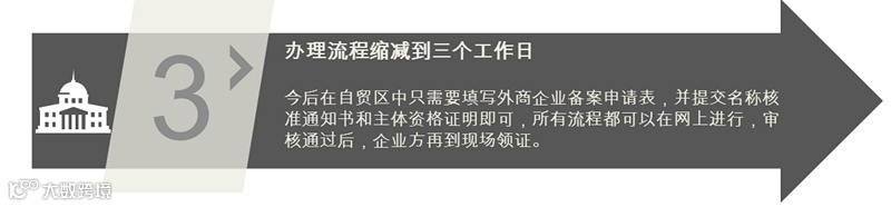 据悉,以前外资企业审批时需要提供包括公司章程、合同以及经过公证认证的驻地资格证明在内的上百页材料,办理时间较长,但今后在自贸区中只需要填写外商企业备案申请表,并提交名称核准通知书和主体资格证明即可,所有流程都可以在网上进行,审核通过后,企业方再到现场领证。据了解,从提交材料到拿到备案证明只需要三个工作日左右。