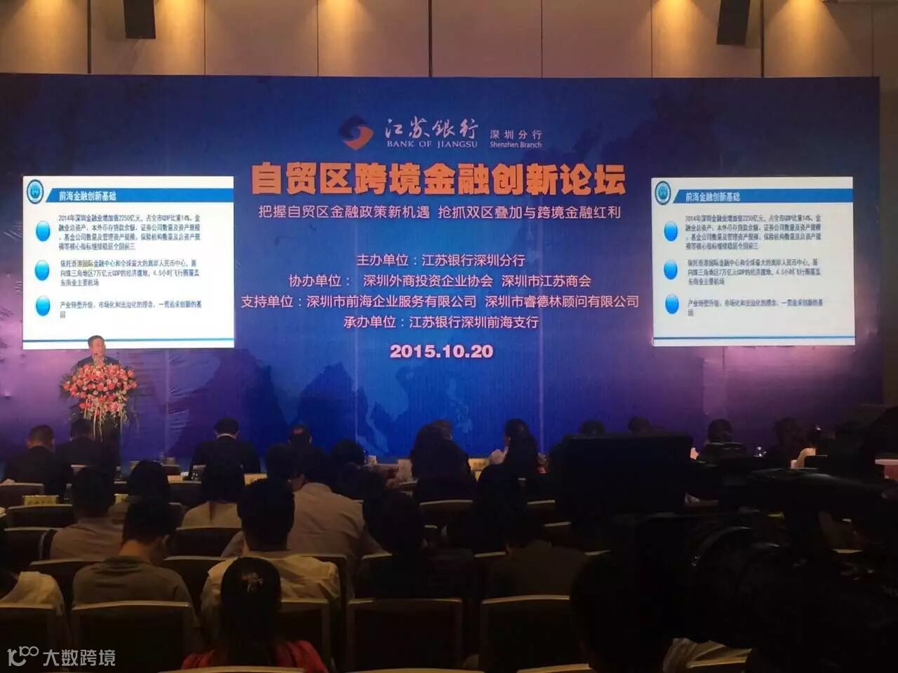 今天下午,由江苏银行深圳分行主办,深圳市前海企业服务有限公司、深圳市睿德林顾问有限公司等协力举办的“自贸区跨境金融创新论坛”在前海国际会议中心举行。本次论坛吸引了融资租赁、跨境电商、供应链、进出口贸易、商业保理、银行、金融服务等多行业代表共计500余人出席。