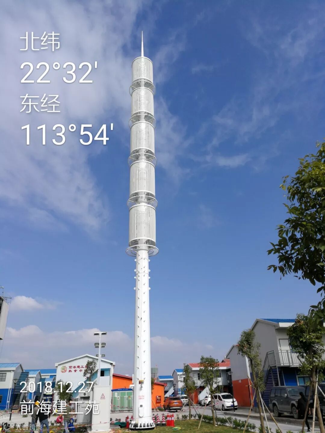 该宏基站位于前海建工苑区域,30米高,独立式,建设时综合考虑了杆体的抗风能力及美观效果,可抗击12级台风,新增5个美化外罩。