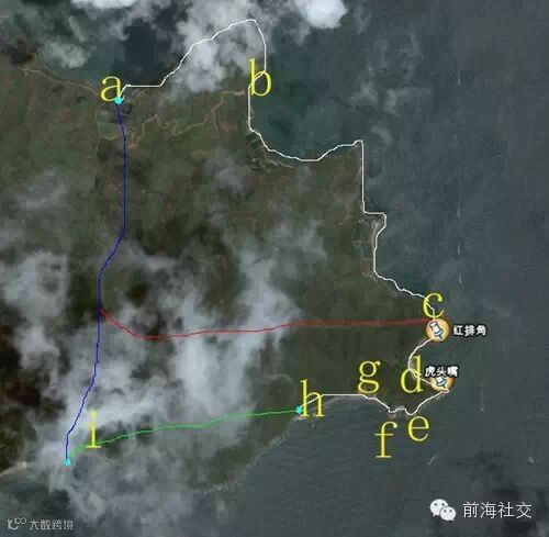 a是出发点;a-b常规是走海岸线绕过廖哥角;不嫌累和麻烦也可以从图上的山路过去,登上蛇山顶,风光无限,东面就是喜洲岛;c西面是明显的防火道和铁丝网,此处已经进入核电站范围。不想前行,可从防火道走山路回起点位置;d可以看到灯塔。