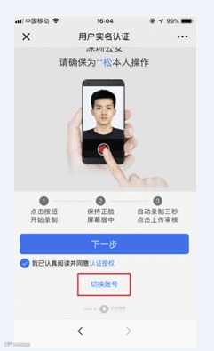 特别提醒:如果在法人实名核身环节不是使用本人微信进行核身,而是使用他人的手机,需在实名核身界面选择“切换账号”