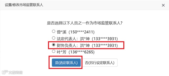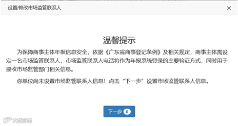 第二步:系统自动弹出市场监管联系人设置提示框,阅读完成后点击“下一步”